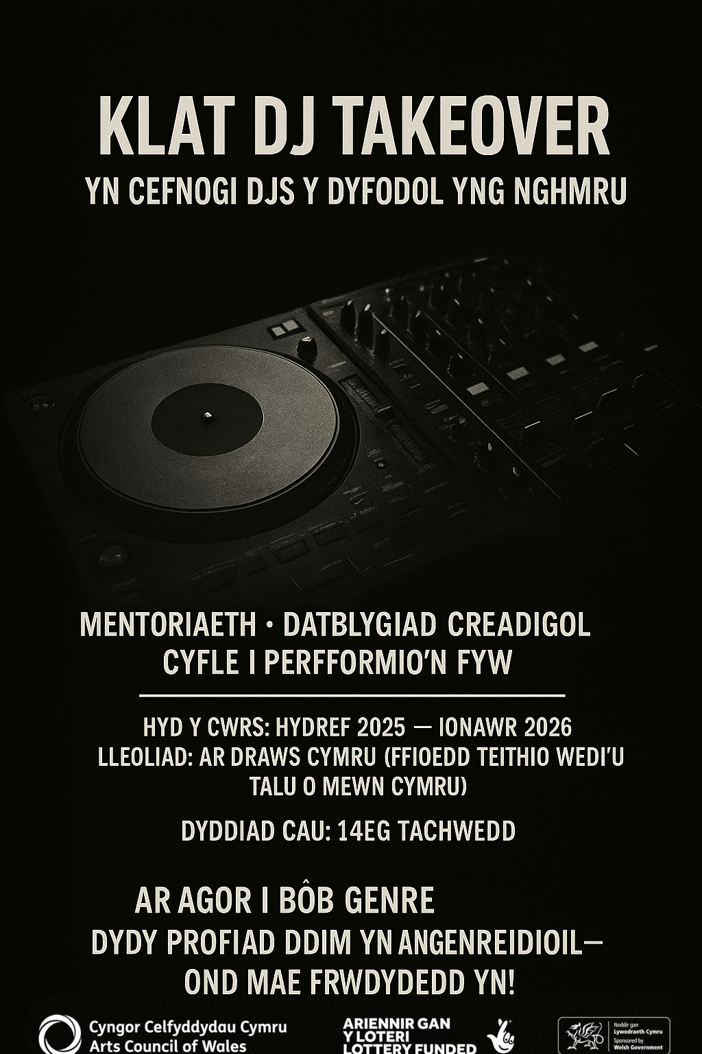 Music in Wales is evolving, and at the heart of that change are young creatives ready to tell their stories through sound. That’s why KLAT Magazine is launching the KLAT DJ Takeover, a new mentorship and creative development programme funded by the Art Council of Wales designed to support emerging DJs who are full of energy, ideas, and passion, but may not have had the platform to shine yet.