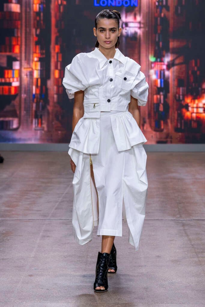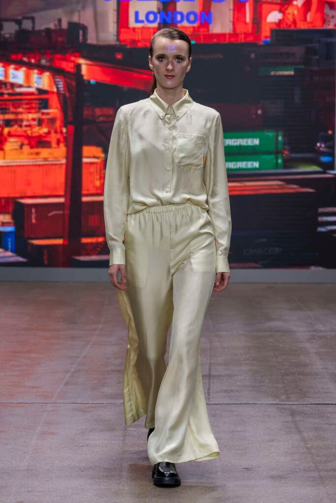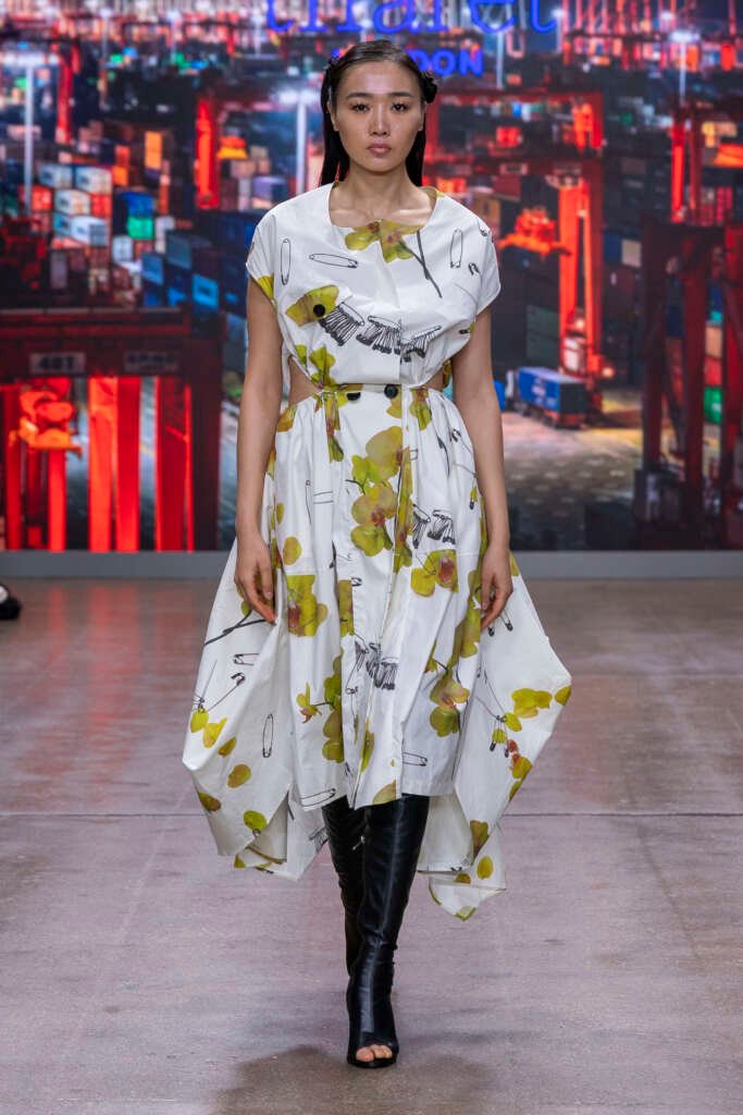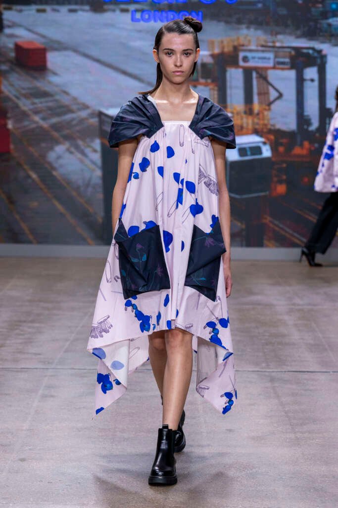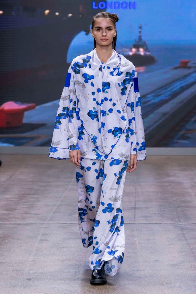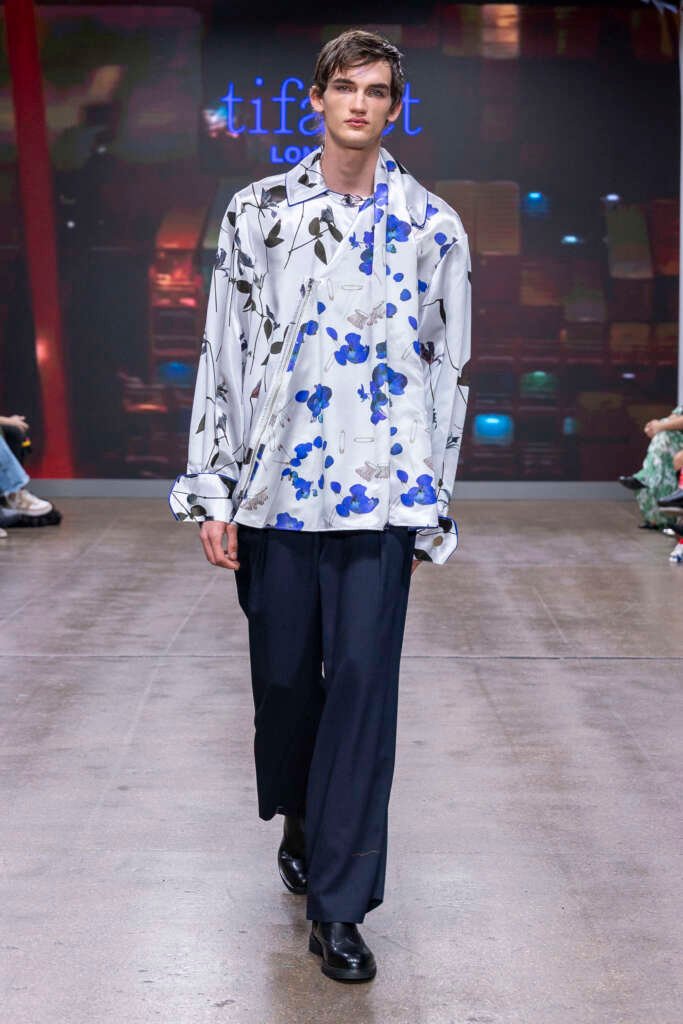 Victorian-influenced silhouettes framed the narrative, but it was the colour story that pulled me in first. Electric blues lit up the runway like neon reflections on water. Gold tones glowed under the lights like lanterns swinging in a harbor breeze. Chinese and tropical florals softened the mood, while the darker pieces, cargo coats, sharply cut trousers and structured jackets brought in the dockside grit, adding a shadow, a weight, a grounding.