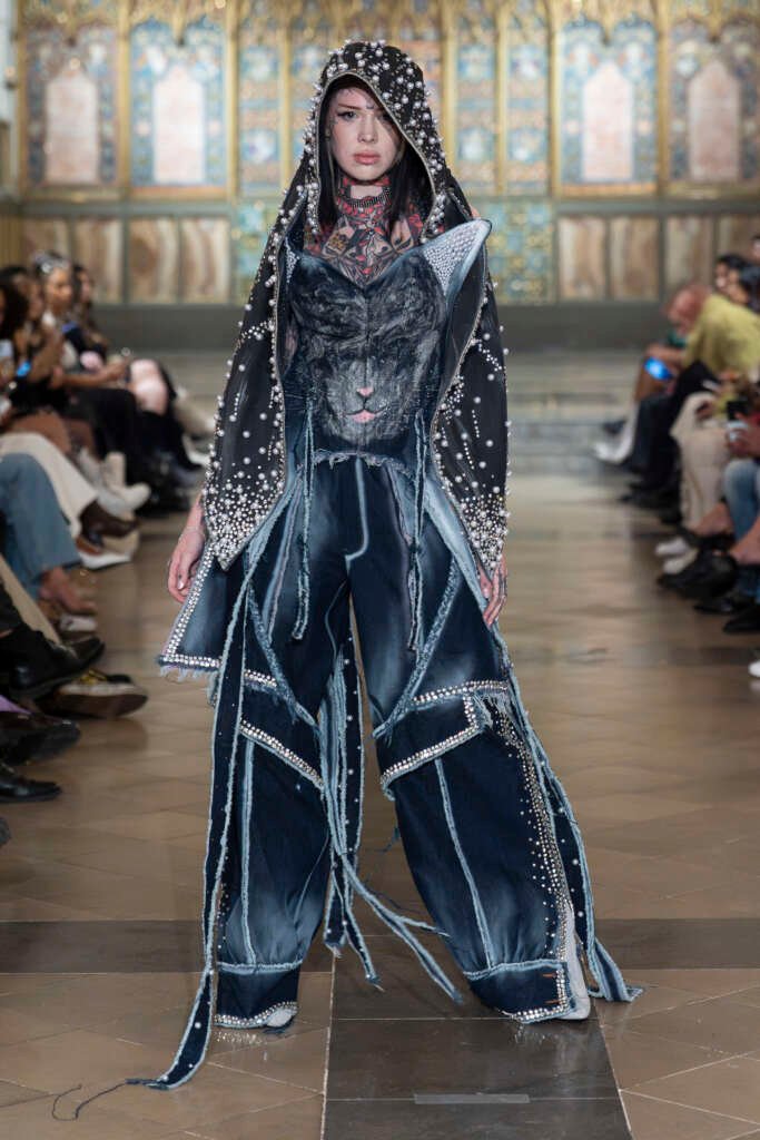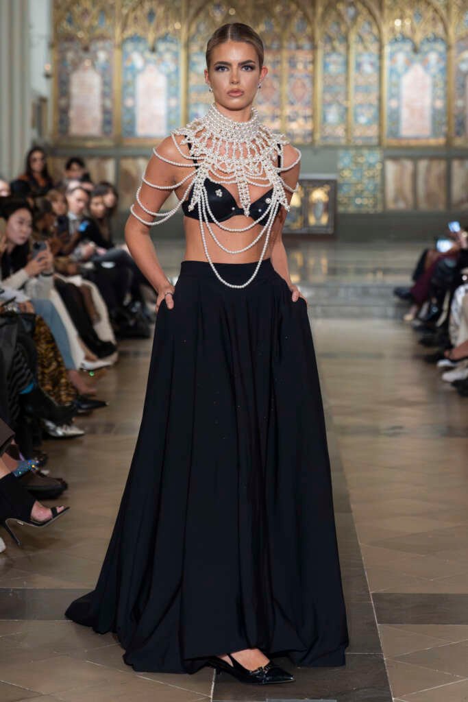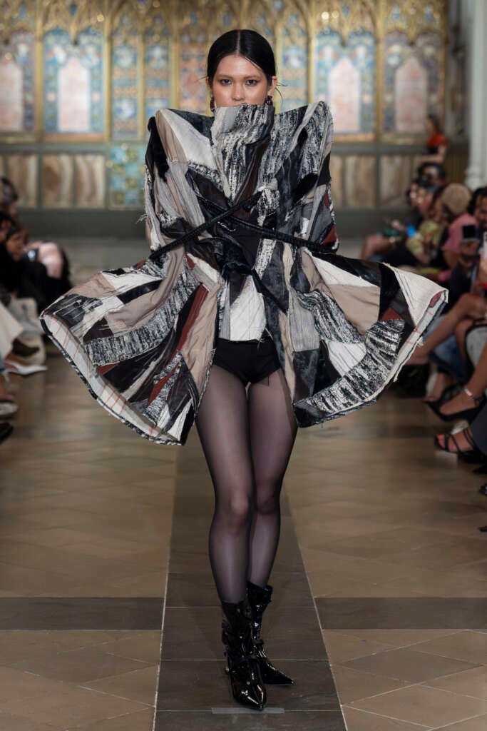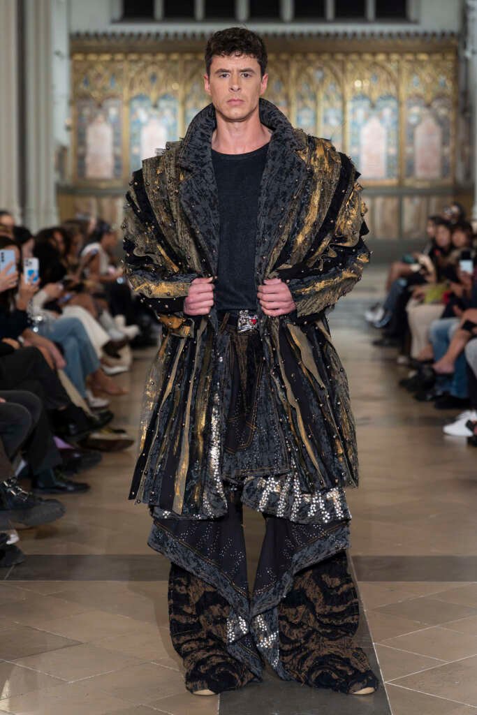 Drama and folklore came alive through London-based brand Púcaí, whose SS26 collection Black Dahlia drew inspiration from Irish mythology. The runway transformed into a world of mystery and wilderness, combining modern elegance with a darker, mythical edge that held the audience’s attention from start to finish.